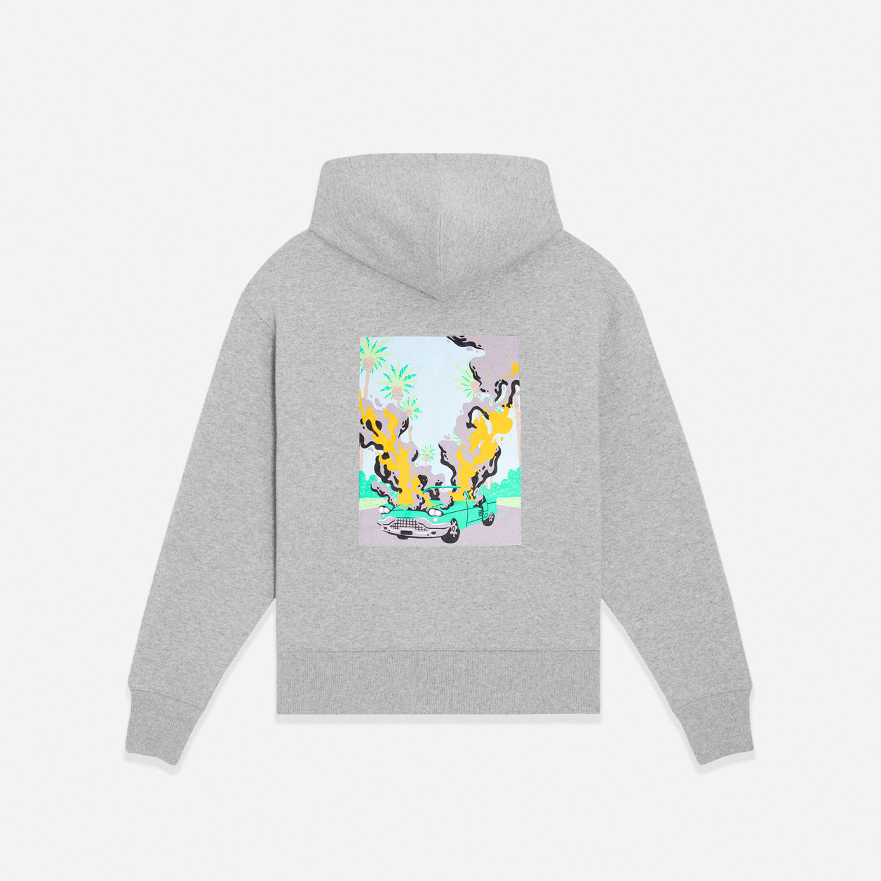 The BURN IN PARADISE model has a heart screen print in Light Blue color (290C) and an 8 colors screen print on the back.